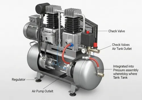 Veo diferentes configuraciones dependiendo de la escala del proyecto. En mis 18 años en la industria, he visto que los compresores de pistón y los compresores de tornillo usan estas válvulas de manera diferente. Necesita saber dónde buscar cuando está buscando piezas para un sitio de construcción. En un compresor de pistón alternativo, generalmente encontrará tres válvulas de retención principales. Hay dos dentro de la cabeza del pistón. Uno deja entrar el aire (entrada), y uno deja salir el aire (salida). Si estos fallan, el compresor simplemente empuja el aire hacia adelante y hacia atrás sin generar presión. Pero el más crítico es entre la bomba del compresor y el tanque receptor de aire. Cuando la bomba se detiene, la tubería entre la bomba y el tanque debe liberar su presión. Llamamos a esto "blow-down". Si la válvula de retención del tanque falla, todo el tanque perderá aire a través de la bomba. En los compresores rotativos de tornillo, el sistema es un poco más complejo. Hay una válvula de retención de entrada. Esto evita que el aceite y el aire "vomiten" fuera del filtro de admisión cuando la máquina se detiene. He visto talleres desordenados donde esta válvula falló y el aceite cubrió el piso. También hay una válvula de retención de presión mínima en la salida. Asegura que el sistema interno tenga suficiente presión para lubricar los tornillos antes de enviar aire a su planta. Aquí hay un desglose de las ubicaciones específicas y sus riesgos: